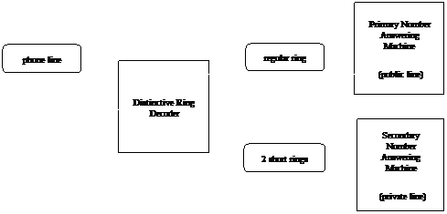 Other stuff I needed: The answering machine connected to the public line is set up to answer after 3 rings; the one connected to the private line answers after 7 rings. Here's how it was all hooked together: