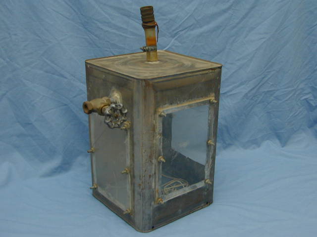 During the summer between 6th and 7th grades, Rick invited some friends and I over for an afternoon of swimming. When we got to the pool, there was a strange contraption lying beside the pool in a heap. It had a clear plastic bucket-looking thing connected to a small compressor with a coil of ½ inch plastic tubing. Rick said it was a diving helmet. He turned the compressor on, donned the bucket-like helmet and jumped in the water. I jumped in too and watched fascinated as he walked around on the bottom of the pool. I took a turn with the thing and the experience was electric. You could stand around underwater breathing normally with plenty of time to look around. My entire underwater experience up to this point amounted to holding my breath while frantically trying to look around or do something. It's hard to describe how different it was to be able to stand there as long as you like gawking at underwater wonders. The diving helmet apparently belonged to one of the renters, because in a week it disappeared. That experience was so cool and fun that I decided to try to build my own diving helmet. I entered 7th grade and over the school year designed my own version of a diving helmet. There were a lot of problems to solve. First I needed a source of compressed air with enough volume to carry away exhaled CO2. My Dad had piston compressor that was great at providing high pressure air but was marginal on volume. The real killer though was oil vapor. A regular piston compressor contains oil to lubricate the cylinder walls. Some of that oil atomizes into a vapor and gets suspended in the air circulating through the compressor. I really didn't relish the thought of breathing oil laced air. Filters are available to remove oil from compressed air. They are used to condition compressed air for use in paint guns. I priced some of these filters and found they were way too expensive for my meager resources. I toyed with building my own filter using a thick layer of cotton batting and a bed of charcoal in a large canister. That just seemed like a huge hassle, and I looked around for easier alternatives. My Mom had a canister vacuum cleaner with a detachable hose. The hose could be connected to the outlet of the vacuum cleaner which provided a nice blast of air. It certainly had the needed volume, but I wasn't sure how much pressure the blower could generate. To test it, I took the vacuum into the bathroom, filled the bathtub, and held the hose underwater. The blower forced air through the tube without the slightest strain. Hey, this might work. I took it out to the horse trough and jammed the hose all the way to the bottom. The blower didn't slow down much and pumped gobs of air. I wasn't sure how much pressure the thing could generate, but the horse trough was almost 3 feet deep. If it could get air down that deep, then it meant I could stand in 8 feet of water as that would put my head at about 3 feet. The vacuum-turned-blower looked like it would work well enough to allow a bit of diving in Rick's pool. The next problem was that of the air hose. I needed a length of tubing to connect the vacuum cleaner at the surface to the helmet underwater. I didn't have the money to buy plastic tubing, so the project stalled again. I puzzled and puzzled over this problem. For a couple of weeks, I kept my eyes peeled for any discarded plastic tubing or something I could adapt to the task. I was fooling around in our backyard one day when I stumbled over the garden hose. Of course, the garden hose! It was perfect. I could get gobs of it, segments could be connected to get any length, it was water tight, it could withstand a good pressure, it had a large diameter enabling it to carry a big volume of air, and best of all it was free. I made an adapter so I could couple the garden hose to the vacuum cleaner. Now to the problem of fabricating the helmet itself. I liberated a rectangular, 5 gallon, metal corn oil can from the dumpster behind my Junior High School. I cut off one end and put it over my head; it fit perfectly! For a faceplate, I located an 6x8 inch piece of 1/16th inch lexan and bolted it to the helmet. I used a pipe nipple and nuts to make an adapter on the top of the helmet to attach the garden hose. I attached a garden valve to the side of the helmet for use as an air vent. I thought I might be able to regulate how much water the helmet displaced by fiddling with the valve. This would allow me go up and down at will in mid-water. One last problem remained to be solved. The counterweight. The helmet displaced 5 gallons of water. Water weighs 8 pounds per gallon, so the helmet would try to float to the surface with 40 pounds of force. That meant the helmet needed 40 pounds of counterweight for neutral buoyancy. I got three large coffee cans and bolted them to the sides of the helmet. I filled them with 25 pounds of lead shot borrowed from my Dad's shotgun shell reloading project. I needed 40 pounds, so to make up the balance I topped the cans off with gravel. I was only able to get about 32 pounds of counterweight into the cans. The sheet metal helmet was on the verge of buckling with all that weight strapped on. This obviously wasn't a very good long term solution, but it was good enough for a trial run. Here's what the original version of the helmet looked like: