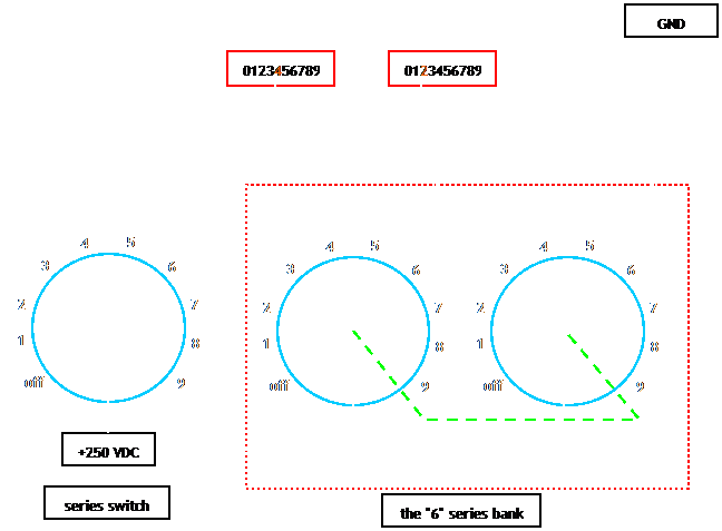 numeric shaped electrodes that glow when 250 VDC is applied. So, summing up, here's a basic explanation of how the user operated it. There was one master switch called the "series" switch. The first operand was dialed into this switch. This setting would activate a corresponding "series bank." The "series bank" was a set of switches where the second operand was dialed in. When the two operands were dialed in, the product would appear in the nixie tube pair. In the example below, the switches are set to give the answer for 6x7.